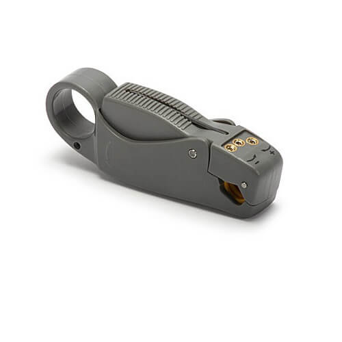 Performs two and three-level stripping of coaxial cables. (Preset for RG6, RG6 Quad)Strips outer jacket, shield braid and inner dielectric.